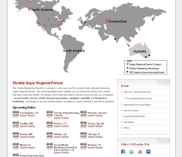 A website built to join thousands of online marketing peers at various conferences throughout North America. I helped to develop this content heavy site in SilverStripe CMS.